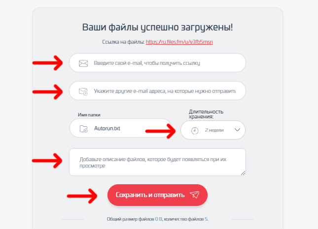 5) After the upload is complete, enter your email address and the email address of the “Aldenta” Medical Center (aldentarakov@gmail.com). You can set the file storage duration or leave it by default (this is how long the files will remain accessible via the download link). Optionally, you may add a comment, then click “Save and send”. After submission, the service may prompt you to create an account or sign in via social networks — this step is optional; you can simply close the tab.