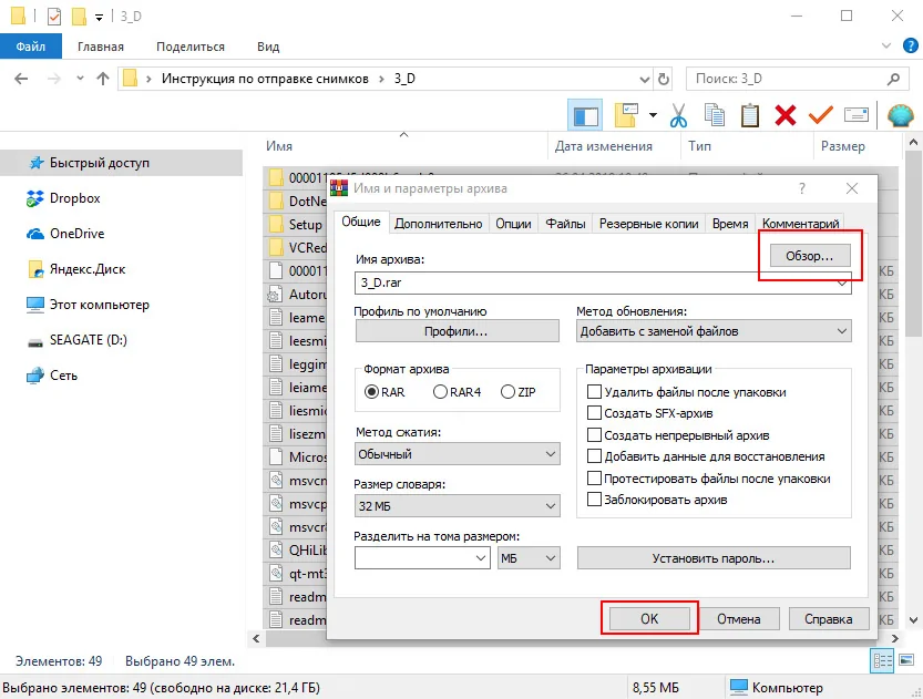 The “Archive name and parameters” window will appear. First, click “Browse…” and select where the archive will be saved — for example, “Desktop”. Then click “OK”. In the “Archive name” field, you can enter a custom name (preferably your last name) or leave the default one generated by the computer.