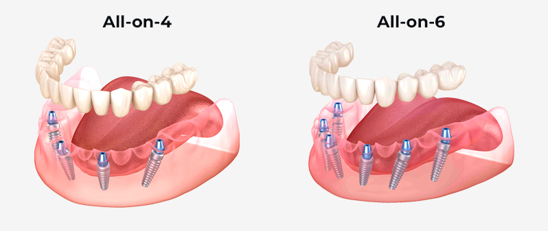 4 or 6 titanium implants are strategically placed in the jaw at a specific angle, and within several days, a fixed (non-removable) full-arch bridge is securely attached.